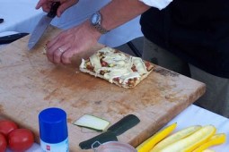 This little piggy went to market and boy did I come away with some goodies. The Goldstream Station Market was advertising a zucchini cook off and zuke races, but due to unforseen circumstances it turned into a zucchini show-off. With just Chef Dave Higgins exihibiting his prowress, I doubt anyone could stand up to this man after tasting his soulfull bruschetta. With the exception of the bread, all ingrediants were local.
