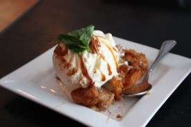 J: My bread pudding was a shocker. There were raisons in it and I don’t like them in baked goods. It should’ve been listed on the menu. Apart from one side of my pudding being burned, it was delicious. They gave me a generous scoop of vanilla ice cream lightly laced with caramel and sprinkled with cinnamon.