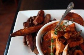 J: I had a good helping of clam and even less of the shrimp. But where was the rice? At least some rice could’ve soaked up the spicy tomato sauce. It killed the clams. And I must ask who decided to decorate my Jambalaya with a mint leaf?