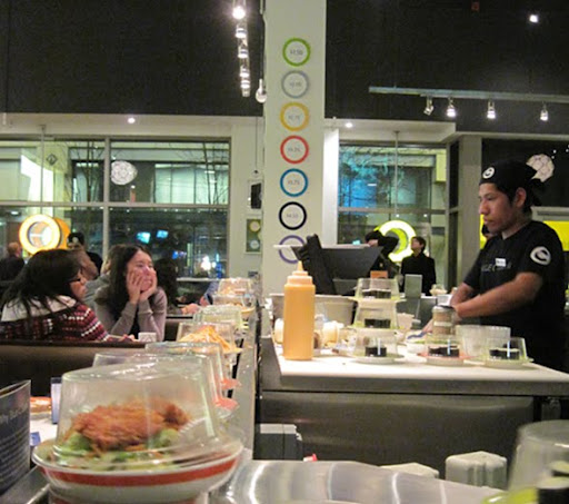 Word to the wise: if diners want to hit the super trendy Japanese restaurants in Seattle, especially Japonessa, get a reservation. After not being able to sweet talk my way to even one seat at the bar (it was just that packed), I walked away dejected and ended up at Blue C Sushi to sing, conveniently enough, the blues away. One glass of Sapporo was enough, and I treated myself to various plates of sushi that rolled by on a conveyor belt.