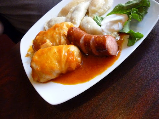 The perogies were of various fills (sauerkraut was my favourite) but these were definitely home-made. The cook moulded them with a fork rather than the fingers. The cabbage rolls come in a pair on the deluxe order. I had only hoped they would multiply into a herd. A really good cabbage roll is one that is soft on the inside as well as the outside. Someone cooked them to perfection. The marriage of rice and meat was a happy one.
