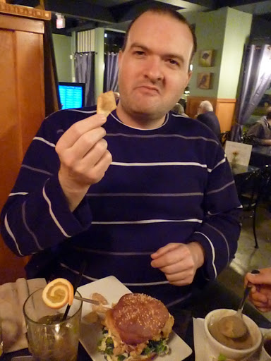 J: But not before I finished my Andersons root beer which is made in-house at the Clay. Now this is root beer! It was almost like drinking a fine champagne, bubbly and swirled just right to bring out a hint of ginger. Fortunately there wasn’t too much carbon. I could safely drink this concoction without making any magical noises afterwards.