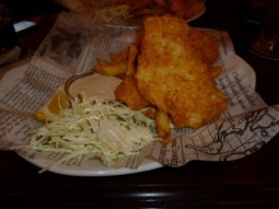 Ed is right about the fries and the coleslaw had no bite, it was warm. I like my coleslaw cool and crisp instead of limp and room temperature. The battered fish was below average. I found an undesirable taste which might have come from the age of the oil they used to fry this fish in. When I need to smother the fish in tartar sauce to improve the taste, that is a sign. I normally avoid using too much tartar but the sauce was the best tasting condiment on the plate.