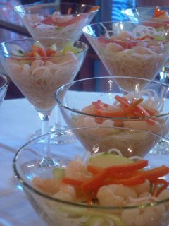 E: Those were sunomono salads, James. I thought the rice vinegar could have been sweetened up and watered down a notch, but that was the dish to go for. But the true highlight of this catered event was the sake. It had a nice fresh fruity finish that tantalized me by the nib of my tongue.