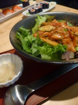 J: I ordered a sunomono salad for starters. It took about 9 minutes to reach the table but that was fine since it appears to have been made fresh. I usually don’t get tomato in my sunomono salad which tells you how different this place really is and how lacking others may be. The sunomono salad was cold with a sweet vinagrette, just the way I like it. I skipped the usual ordering of pop (I didn’t see it on the menu) and went for straight water. But the server revealed one of my pet peeves. If you are going to be refilling the glass of your customer, the thing you do not do is allow the spout of the pitcher to touch the glass where someone’s lips may have been. Watch for that the next time you’re out dining. At worst it may be considered a health hazard and at best it’s disgusting.