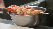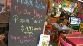 As I walked around, I caught sight of La Cocina de mama Oli‘s prawn tacos. At $5 per, they were pricey but at least the cooks stuffed the tiny soft taco shell with three pieces of prawn to go with the coleslaw. The mayo was watery, but I snarfed the snack like it was a treat and I was already thinking about another meal. I waited because eventually, the Community Kitchen would offer up some cooking demonstrations with prawn. The first demo offered a marinated prawn salad with pita bread.