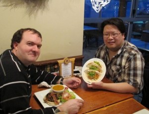 J: It seems I can’t get my hands on some decent tea. Instead of sitting in the Fairmont Empress drinking tea from a nice China cup, having a tea-pot and all the amenities that it brings, because of a parking issue with our photographer’s car, I’m drinking tea from a mug with coffee creamers on a side plate. And instead of the Empress’ own blend or even some British created tea bag, its English Breakfast from an American company called Harney & Sons. Oh how we’re living it up now. Pinkies raised, pinkies raised.