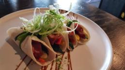 Even though we ordered light meals, we were still hungry and went omakase. We had tempura, more tacos, pressed sushi, dumplings and nigiri. The tuna tasted better than the salmon, and duck meat tacos. Some were solid hits. We were playing tic-tac-toe with the nine items offered to us to taste test. They were playing it safe with half the board.